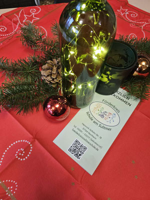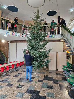Der Tannenbaum wurde mit vereinten Kräften aufgestellt und, wie jedes Jahr, von den Kindern liebevoll geschmückt. Jetzt erstrahlt er in der Eingangshalle der Schule und sorgt bei allen Kindern wie auch bei den Lehrkräften für strahlende Augen und festliche vorweihnachtliche Stimmung.